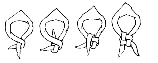 Hos Megalipperne bærer vi et rødt tørklæde. Tørklædet bindes enten med en firknob (som vist nedenfor) eller holdes sammen med en tørklædering.